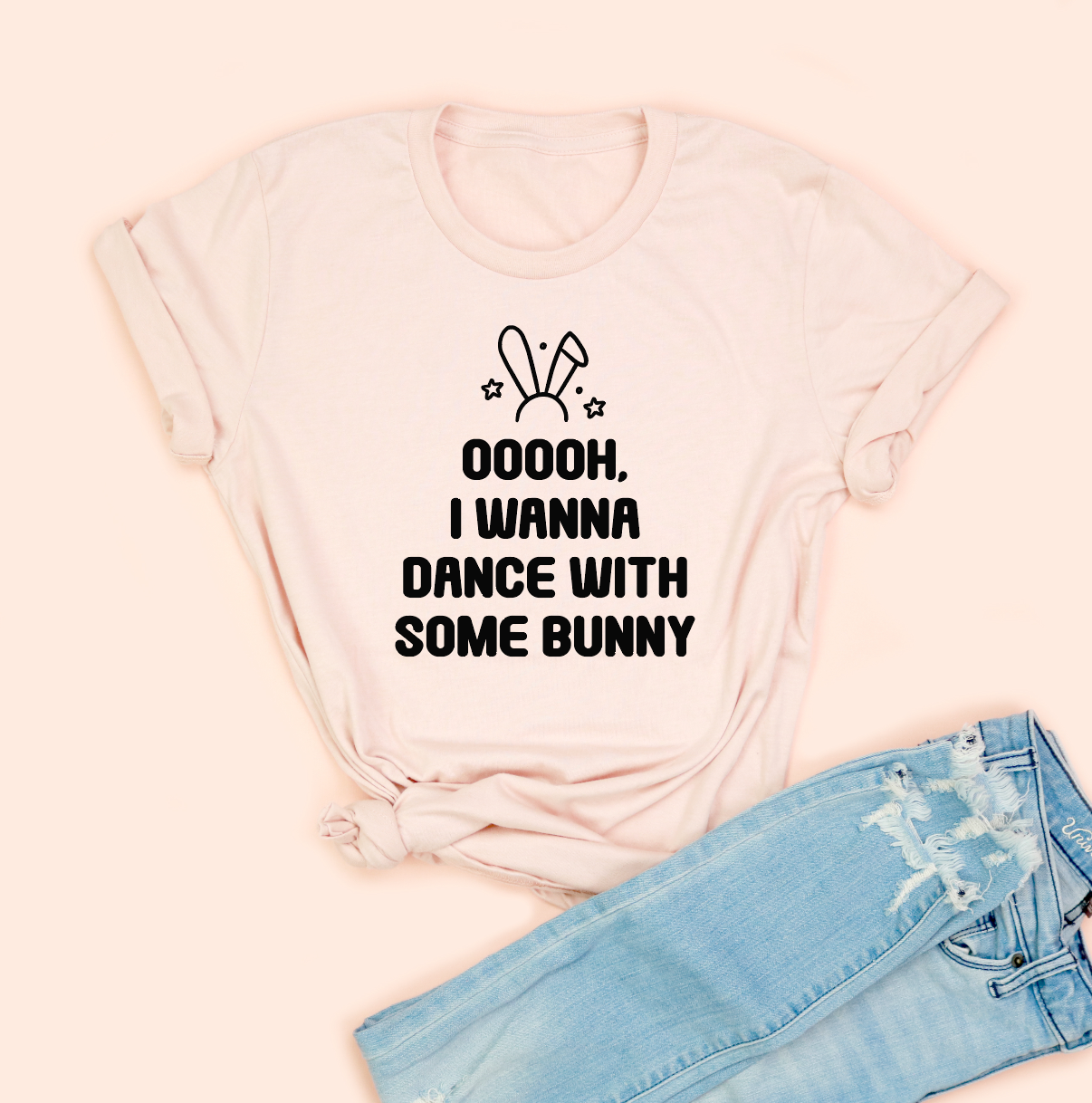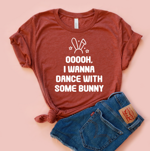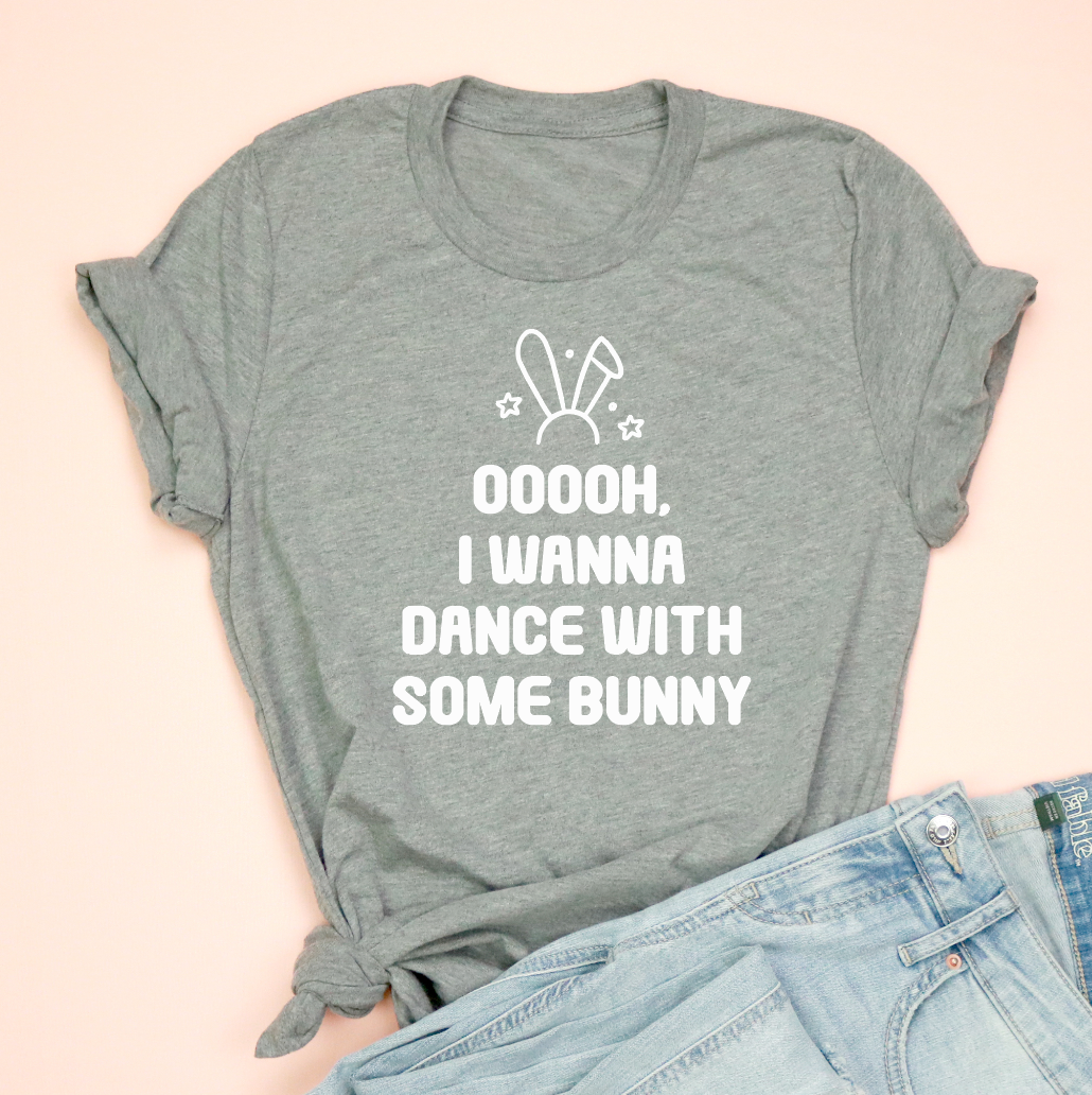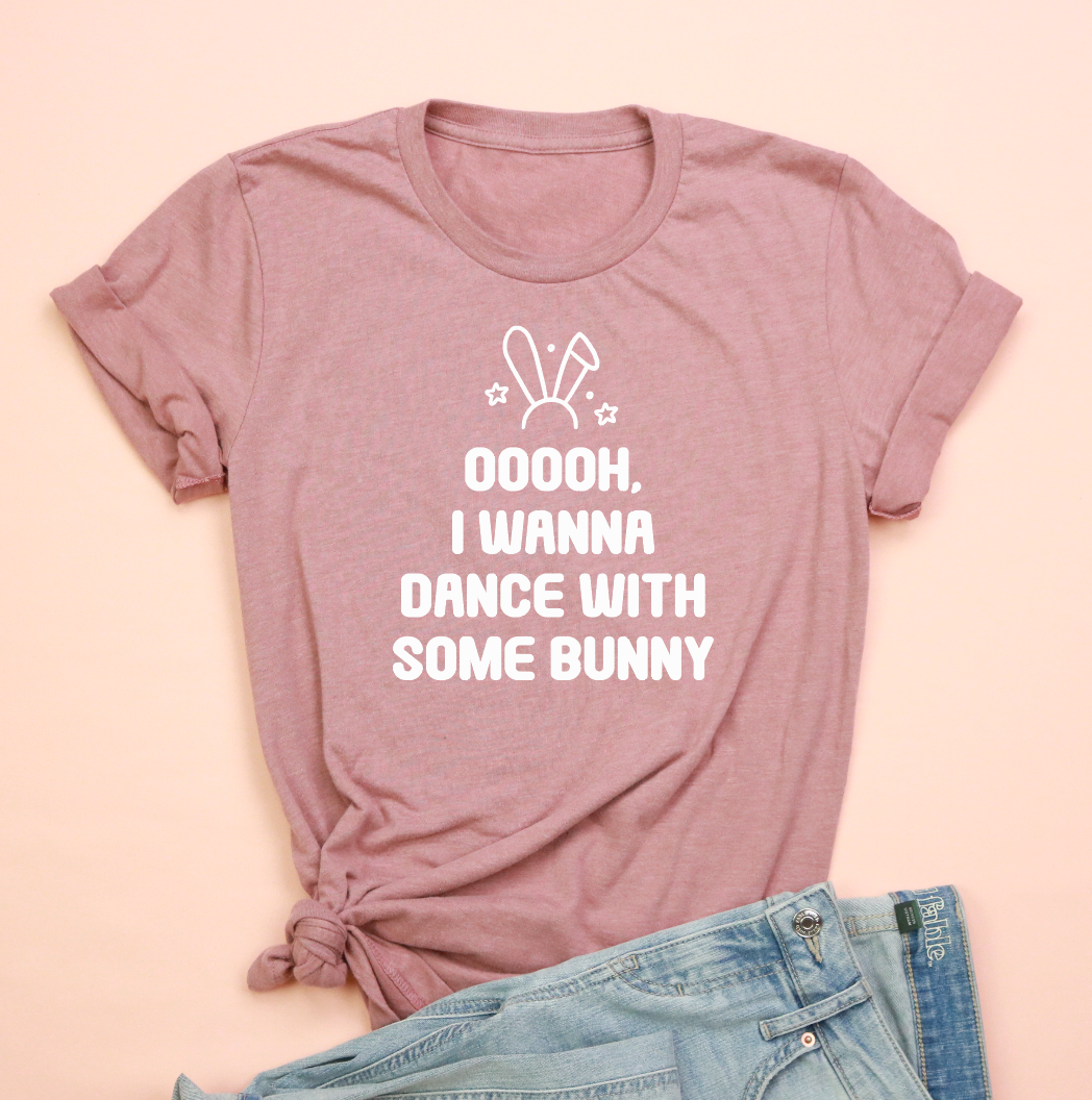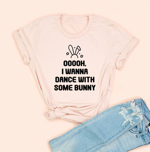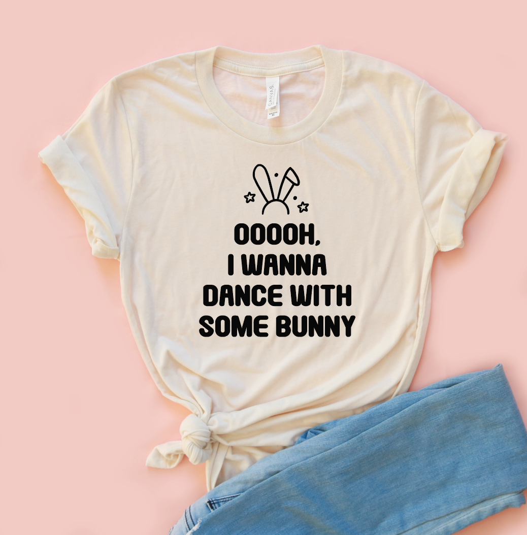 - Playful white front print: bunny icon with bold block text saying “OOOOh, I wanna dance with some bunny”